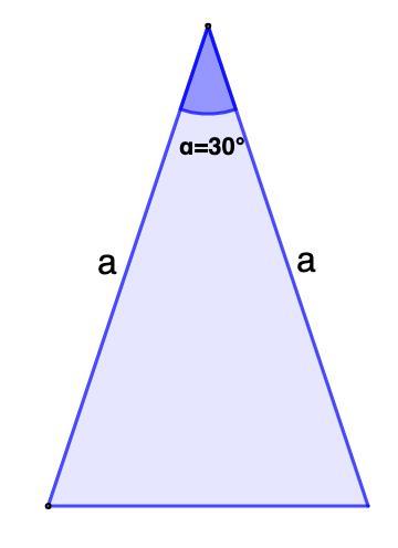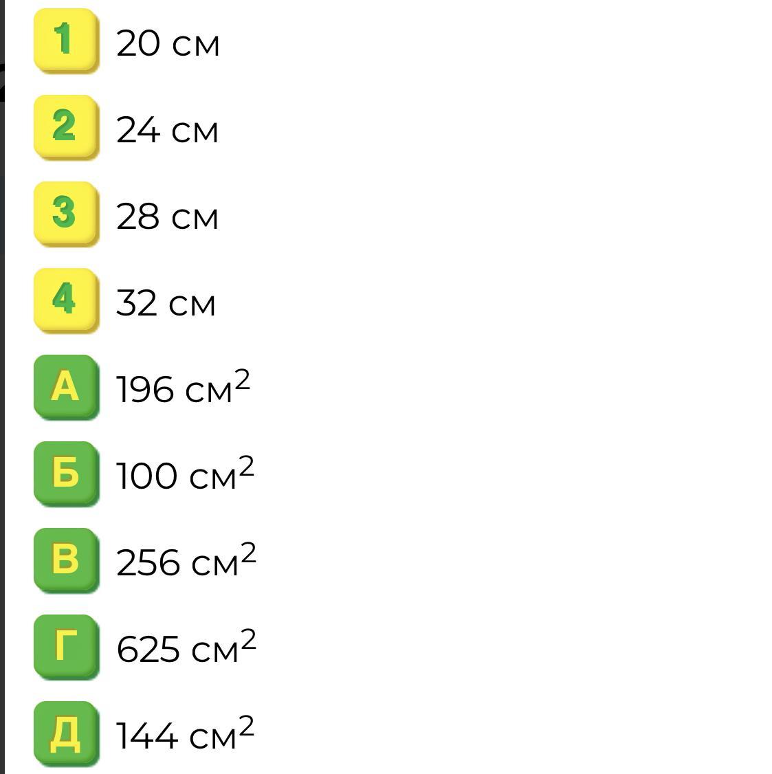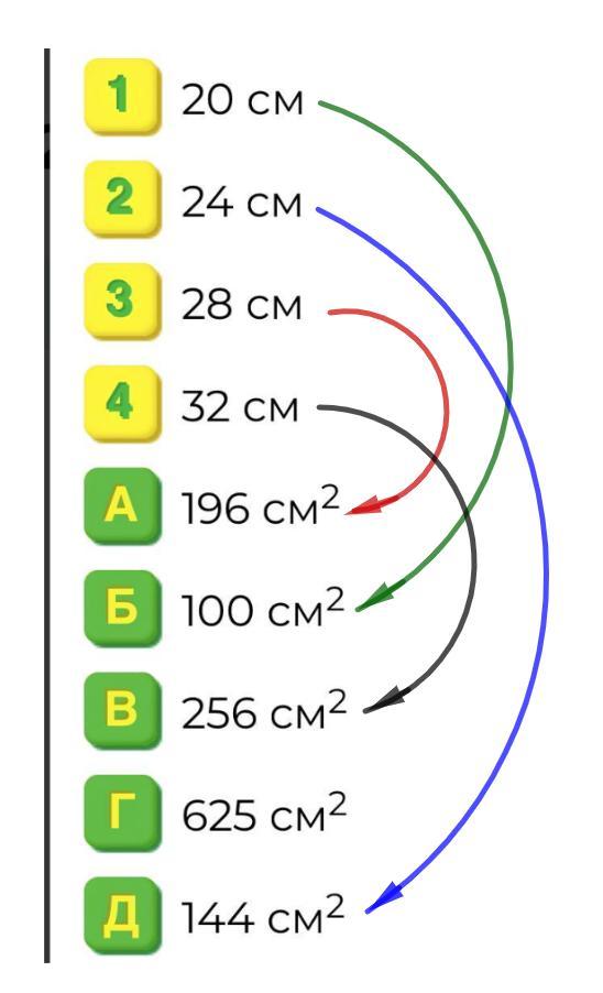 Установить соответствие между длинами боковых сторон равнобедренных треугольников (1 – 4), угол между которыми равен 30°, и площадями (A-Д) этих треугольников.