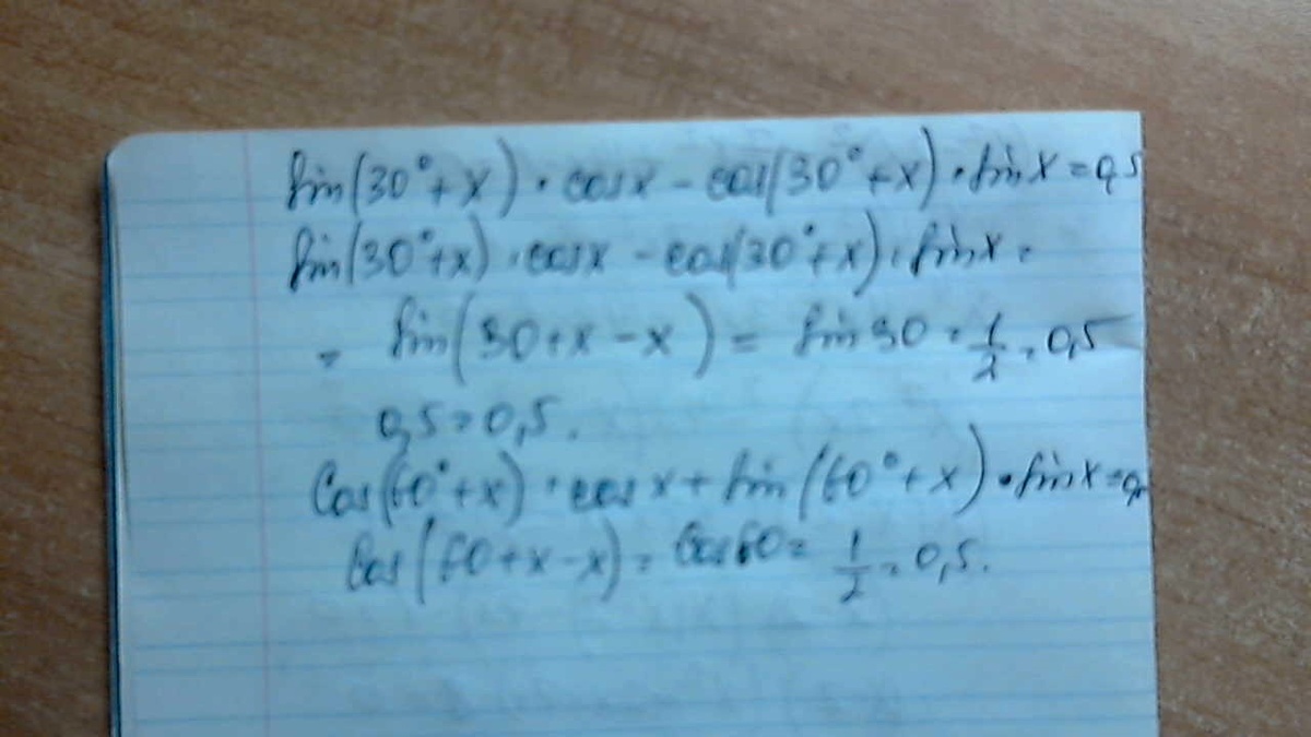 1)sin(30градусов+x)сosx-cos(30градусов+x)sinx=0,5