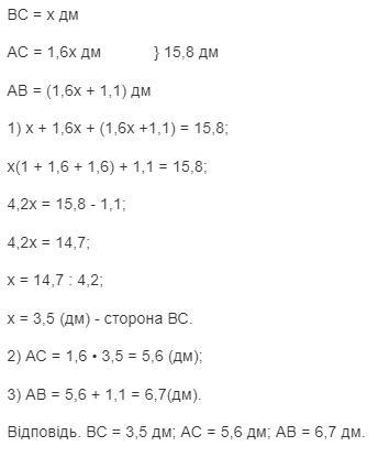 Периметр трикутника ABC дорівнює 15,8 дм. Сторона АС більша за сторону ВС в 1,6 раза і менша від сторони AB на 1,1 дм. Знайди довжину кожної СТОРОНИ.