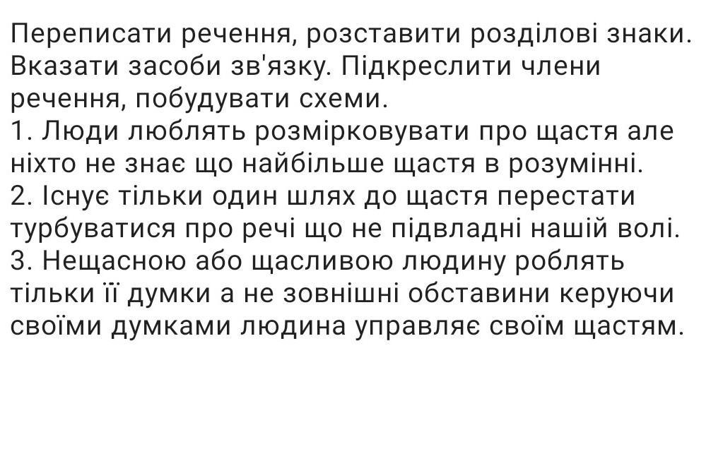 Переписати речення, розставити розділові знаки. Вказати засоби зв'язку. Підкреслити члени речення, побудувати схеми. 1. Люди люблять розмірковувати про щастя але ніхто не знає що найбільше щастя в розумінні. 2. Існує тільки один шлях до щастя перестати турбуватися про речі що не підвладні нашій волі. 3. Нещасною або щасливою людину роблять тільки її думки а не зовнішні обставини керуючи своїми думками людина управляє своїм щастям. будь ласка допоможіть