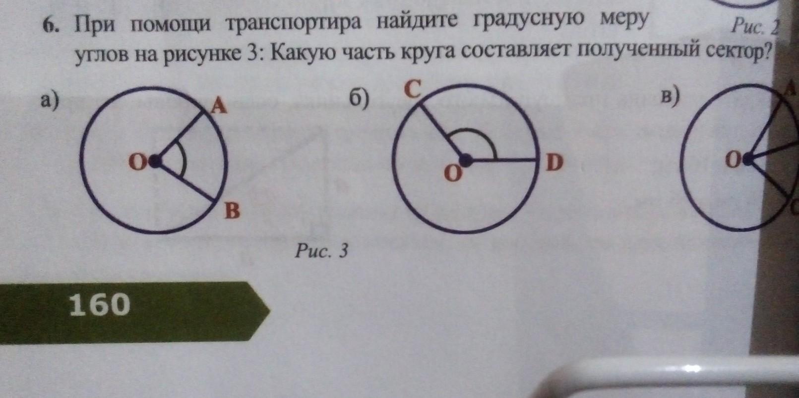 при помощи транспортира найдите градусную меру углов на рисунке 3:какую часть круга составляет полученный сектор пжж помогите