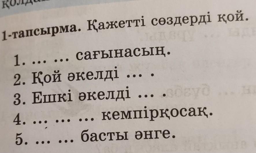 - 1-тапсырма. Қажетті сөздерді қой. 1. ... ... сағынасың. 2. Қой әкелді 3. Ешкі әкелді ... суд ... н 4. ... 5. ... ... басты әнге. кемпірқосақ.