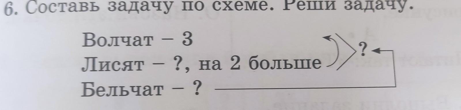 Составь задачу по схеме. Реши задачу. Волчат - 3 - Лисят - ?, на 2 больше Бельчат - ?