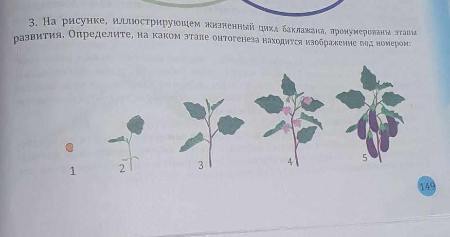 3. На рисунке, иллюстрирующем жизненный цикл баклажана, пронумерованы этапы развития. Определите, на каком этапе онтогенеза находится изображение под номером: 1 2 3 4 5 149