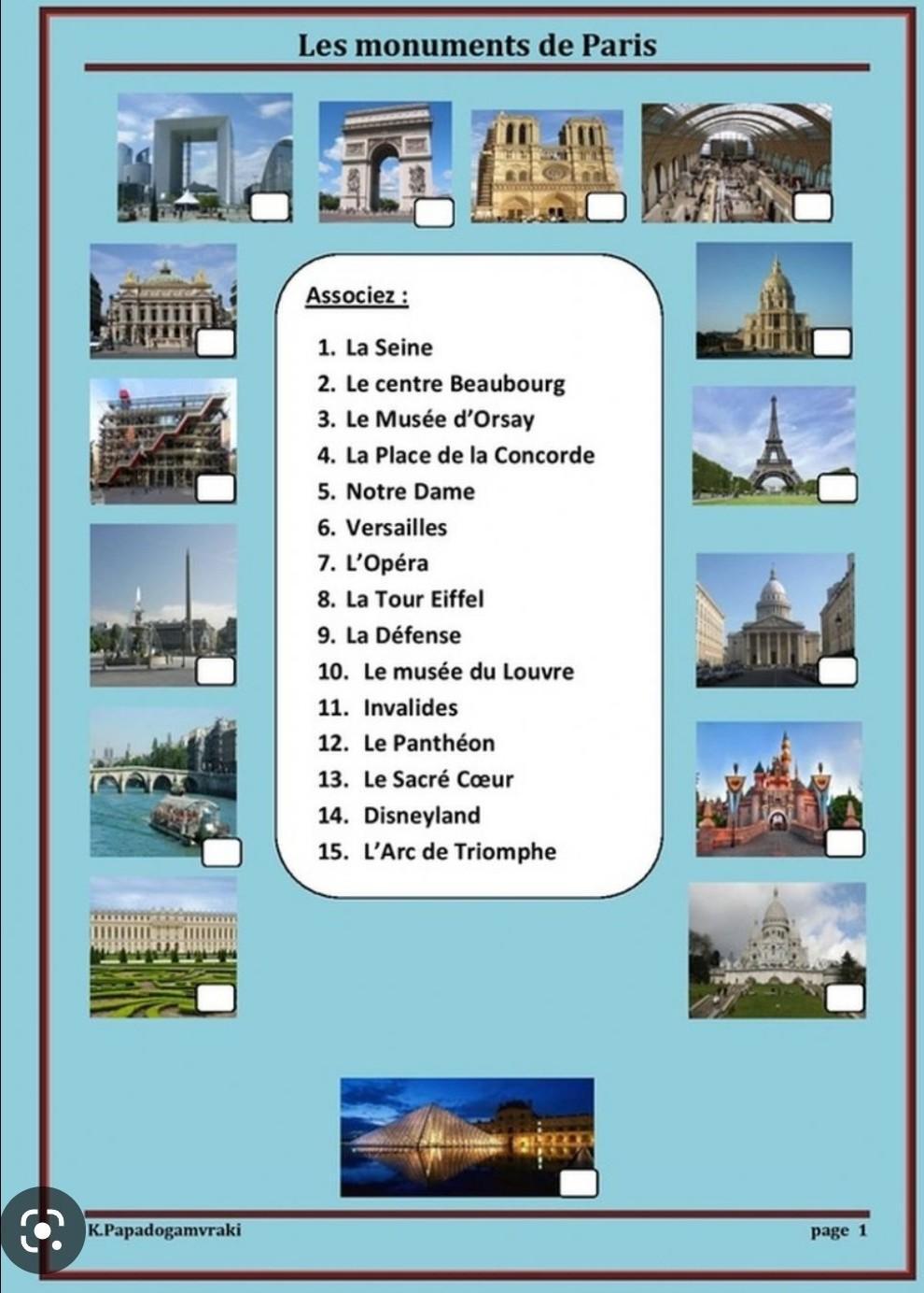 K.Papadogamvraki Les monuments de Paris Associez: 1. La Seine 2. Le centre Beaubourg 3. Le Musée d'Orsay 4. La Place de la Concorde 5. Notre Dame 6. Versailles 7. L'Opéra 8. La Tour Eiffel 9. La Défense 10. Le musée du Louvre 11. Invalides 12. Le Panthéon 13. Le Sacré Cœur 14. Disneyland 15. L'Arc de Triomphe page 1