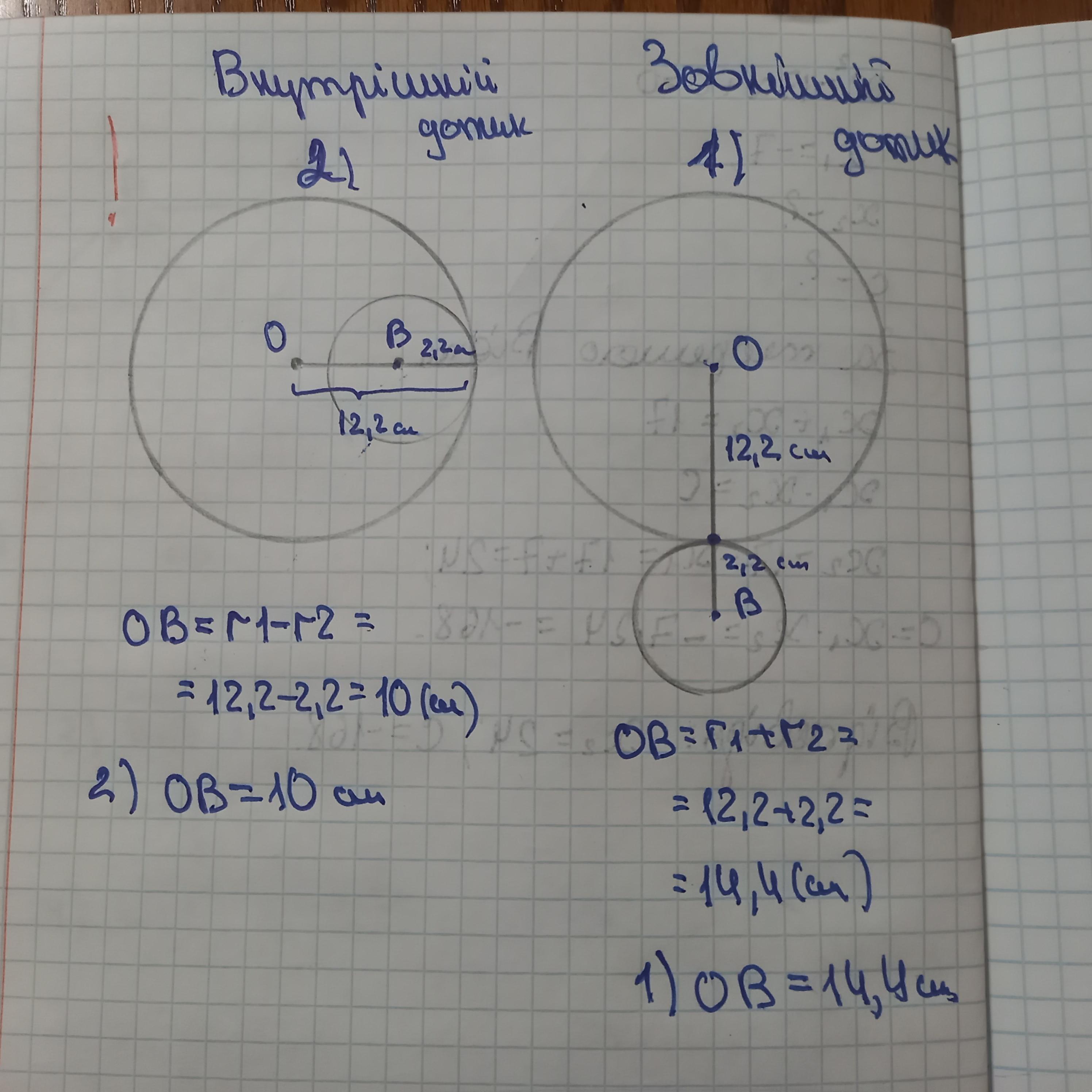 Побудуй кола центрами в точках O і B та радіусами r1 = 12,2 см, r2= 2,2 см таким чином, аби вони мали одну спільну точку.
