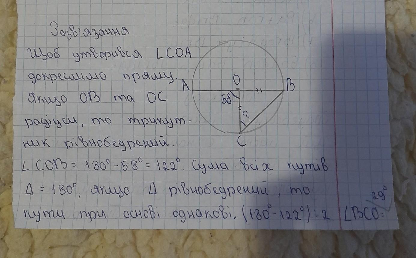Допоможіть №1 Точка О - центр кола. АВ- його діаметр, ВС - його хорда. Кут СОА дорівнює 50*. Знайдіть кут BCO.
