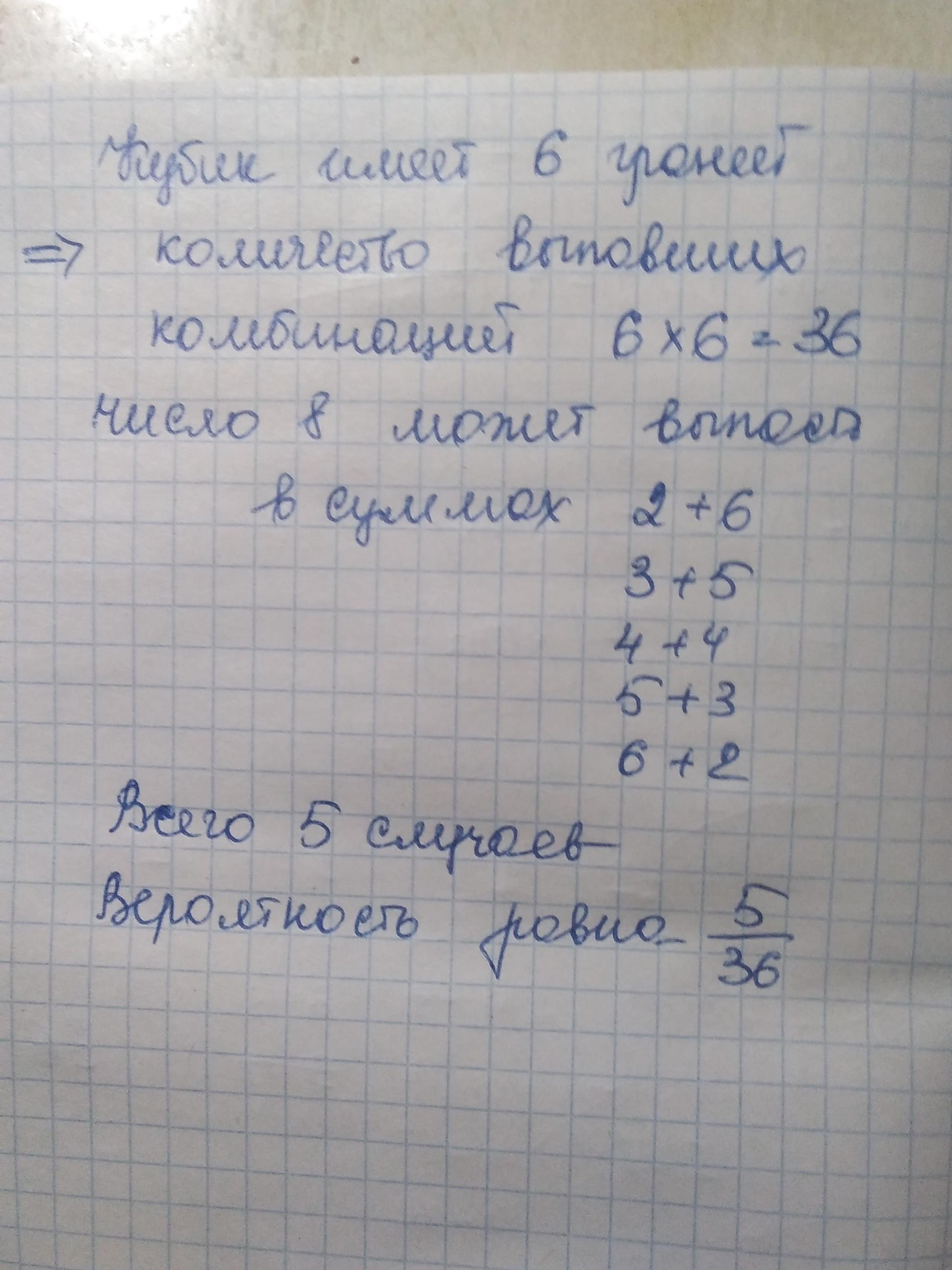 АЛГЕБРА!!!!! Підкидають два гральні кубики. Яка ймовірність того, що сума очок, що випали дорівнює 8.