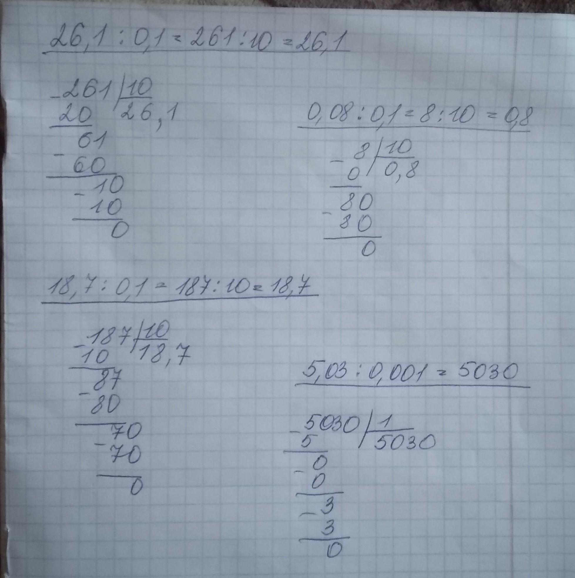 а) 26,1 : 0,1; б) 0,08 : 0,1; в) 18,7 : 0,1; г) 5,03 : 0,001.