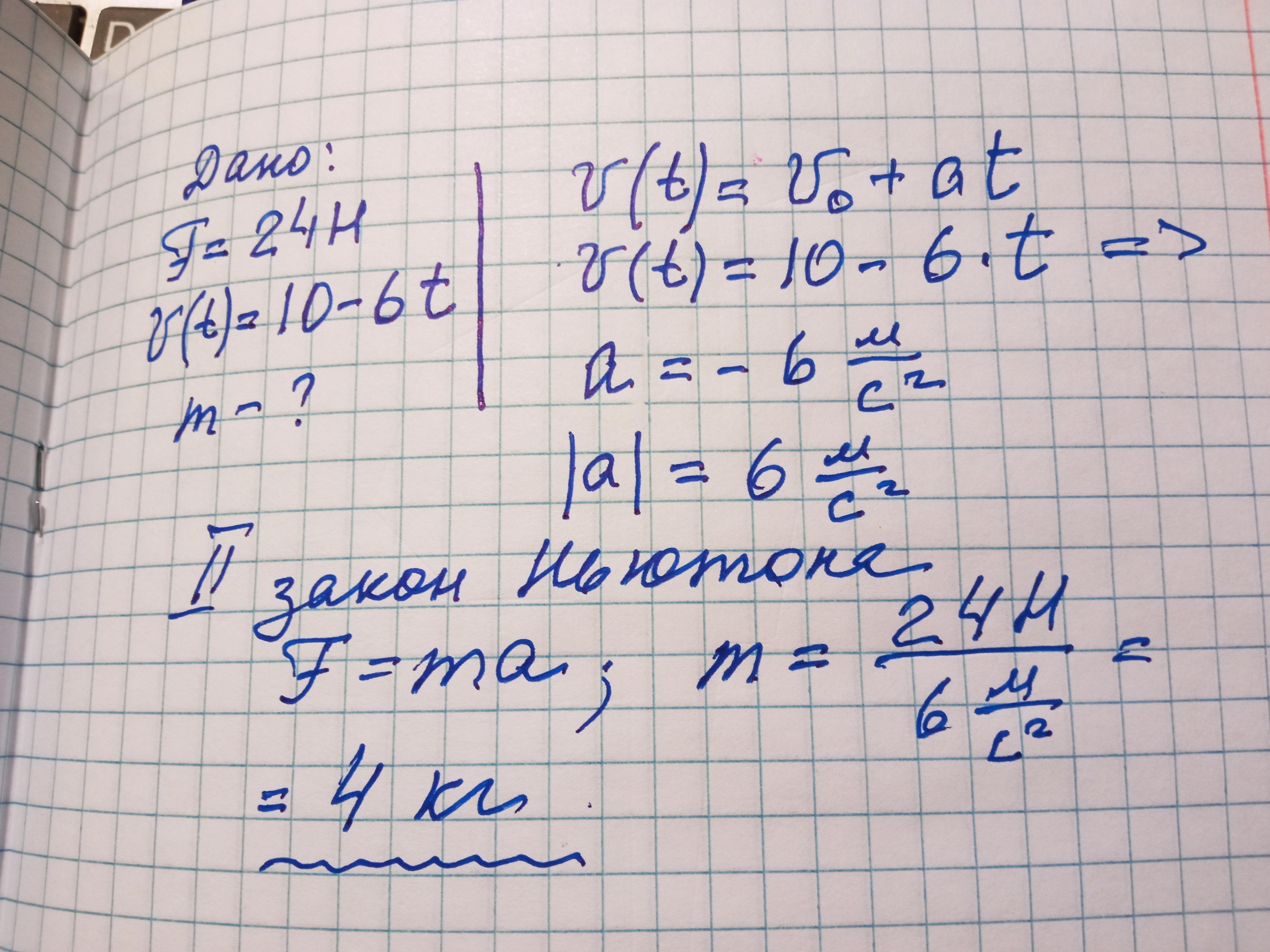 швидкість прямолінійного руху тіла під дією сили 24 Н змінюється за законом V=10-6t визначити силу прикладену до тіла