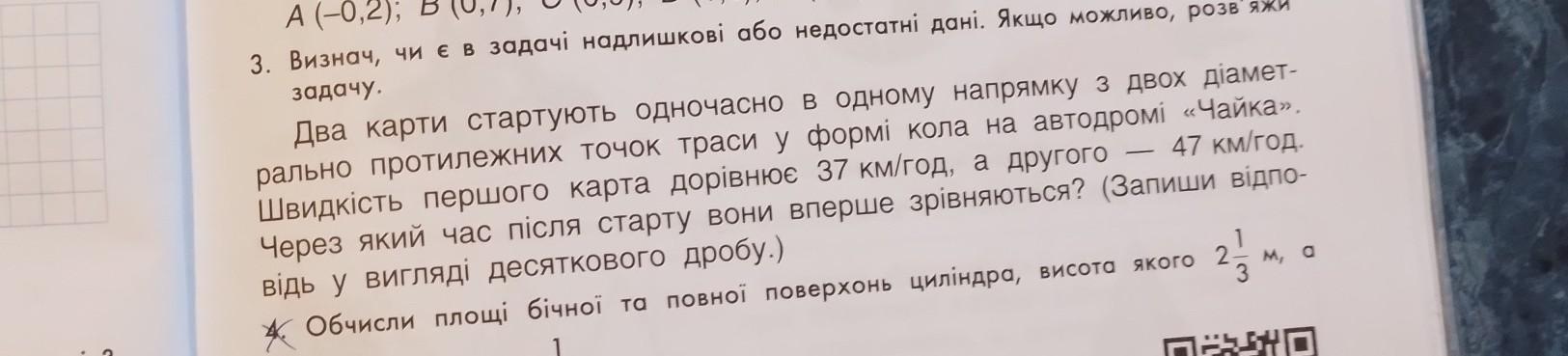 3. Визнач, чи є в задачі надлишкові або недостатні дані. Якщо можливо, розв'яжи задачу. Два карти стартують одночасно в одному напрямку з двох діамет- рально протилежних точок траси у формі кола на автодромі «Чайка». 47 км/год. Швидкість першого карта дорівнює 37 км/год, а другого Через який час після старту вони вперше зрiвняються? (Запиши відпо- відь у вигляді десяткового дробу.) 2²/1 дра, висота якого