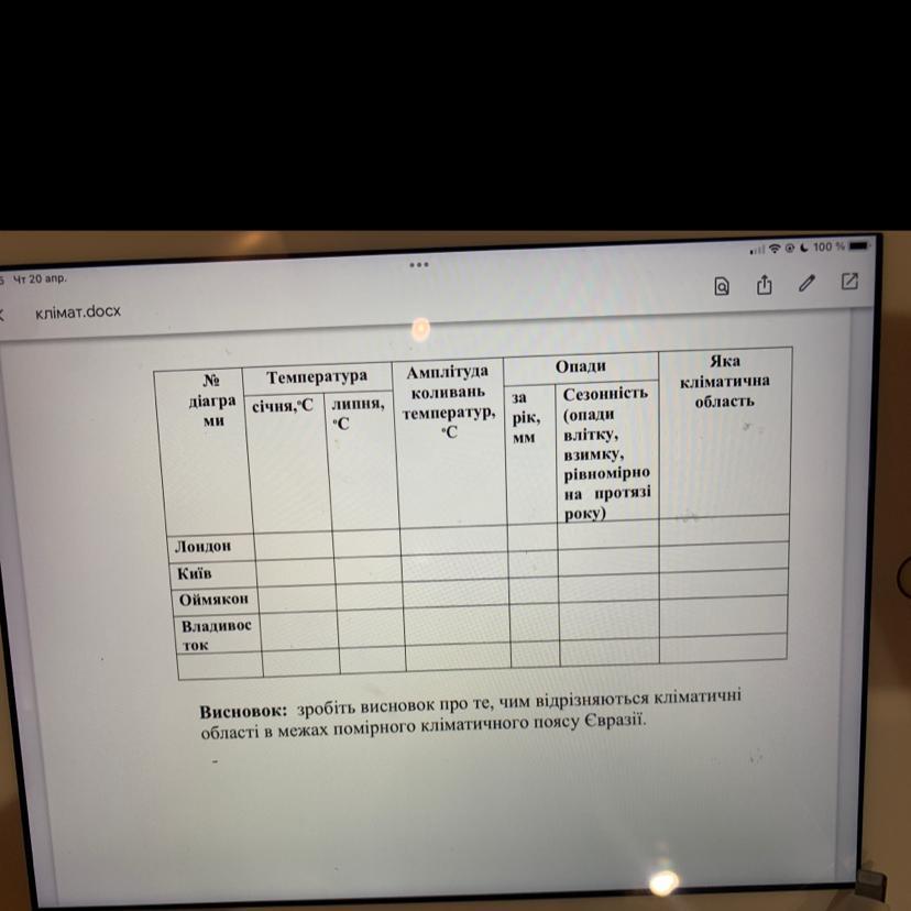5. Проаналізувавши кліматичні діаграми (стр.208), заповніть таблицю
