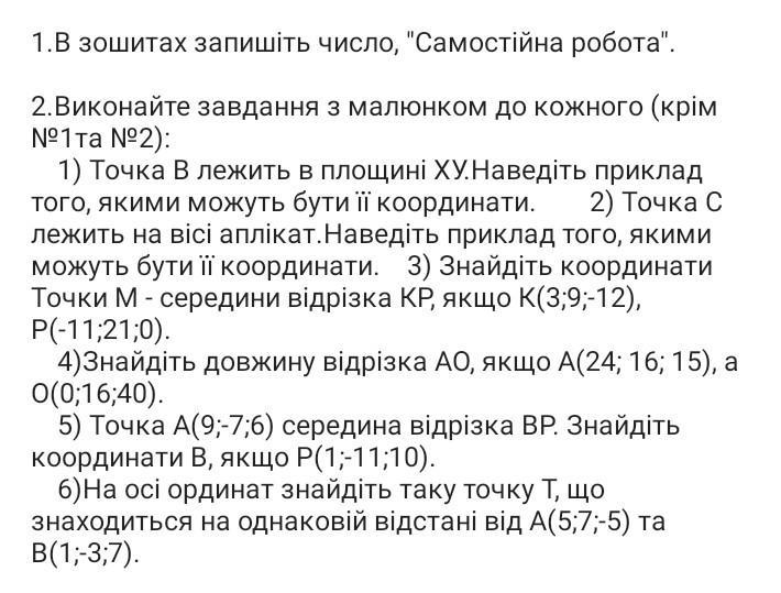 1.В зошитах запишіть число, "Самостійна робота". 2. Виконайте завдання з малюнком до кожного (крім №1та №2): 1) Точка В лежить в площині ХУ.Наведіть приклад того, якими можуть бути її координати. | 2) Точка С лежить на вісі аплікат.Наведіть приклад того, якими можуть бути її координати. 3) Знайдіть координати Точки М - середини відрізка КР, якщо K(3;9;-12), P(-11;21;0). 4)Знайдіть довжину відрізка АО, якщо А(24; 16; 15), а 0(0;16;40). 5) Точка А(9;-7;6) середина відрізка ВР. Знайдіть координати В, якщо P(1;-11;10). 6)На осі ординат знайдіть таку точку Т, що знаходиться на однаковій відстані від A(5;7;-5) та B(1;-3;7).