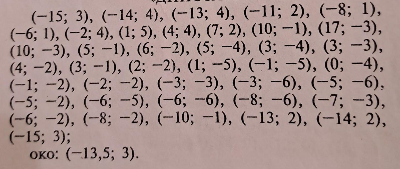 (-15; 3), (-14; 4), (-13; 4), (-11; 2), (-8; 1), (−6; 1), (−2; 4), (1; 5), (4; 4), (7; 2), (10; −1), (17; -3), (10; -3), (5; -1), (6; -2), (5; -4), (3; -4), (3; -3), (4; -2), (3; -1), (2; -2), (1; -5), (-1; -5), (0; -4), (-1; -2), (-2; -2), (-3; -3), (-3; -6), (-5; -6), (-5; -2), (-6; -5), (-6; -6), (-8; -6), (-7; -3), (-6; -2), (-8; -2), (-10; -1), (-13; 2), (-14; 2), (-15; 3); OKO: (-13,5; 3). Будь ласка час є до завтра