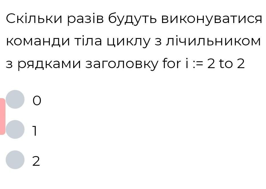Скільки разів будуть виконуватися команди тіла циклу з лічильником з рядками заголовку for i := 2 to 2