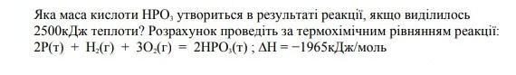 Яка маса кислоти НРО3, утвориться в результаті реакції, якщо виділилось 2500кДж теплоти? Розрахунок проведiть за термохiмiчним рівнянням реакції: 2P(т) + H2(г) + 302(г) = 2HPO3(т); ∆Н = -1965кДж/моль
