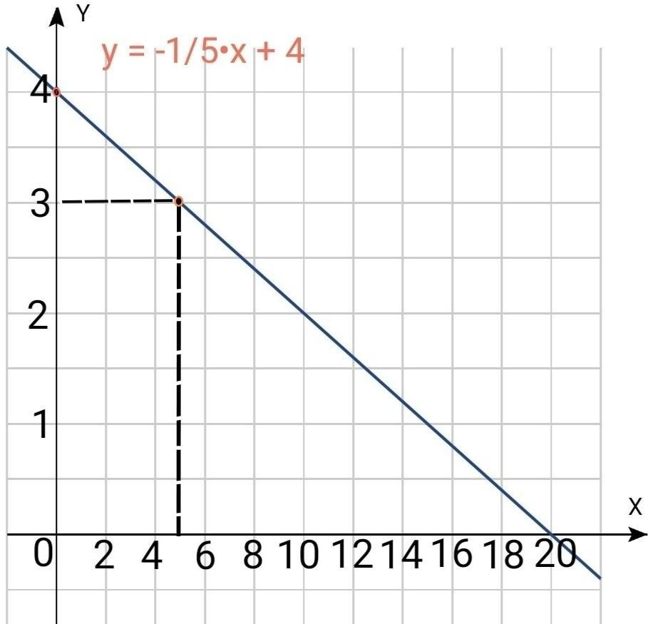 Если х = 5, то у = - 1/5•5 + 4 = 3;