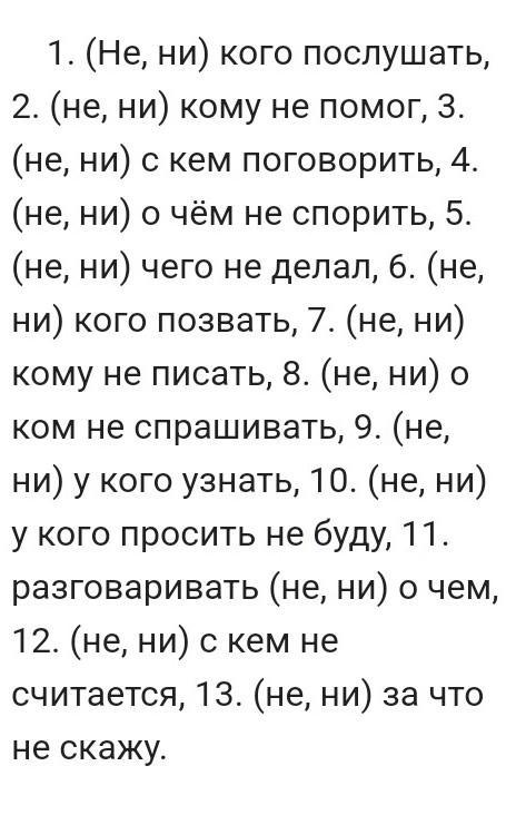 16. Выпишите местоимения, в которых пишется частица НЕ : 1. (Не, ни) кого послушать, 2. (не, ни) кому не помог, 3. (не, ни) с кем поговорить, 4. (не, ни) о чём не спорить, 5. (не, ни) чего не делал, 6. (не, ни) кого позвать, 7. (не, ни) кому не писать, 8. (не, ни) о ком не спрашивать, 9. (не, ни) у кого узнать, 10. (не, ни) у кого просить не буду, 11. разговаривать (не, ни) о чем, 12. (не, ни) с кем не считается, 13. (не, ни) за что не скажу.