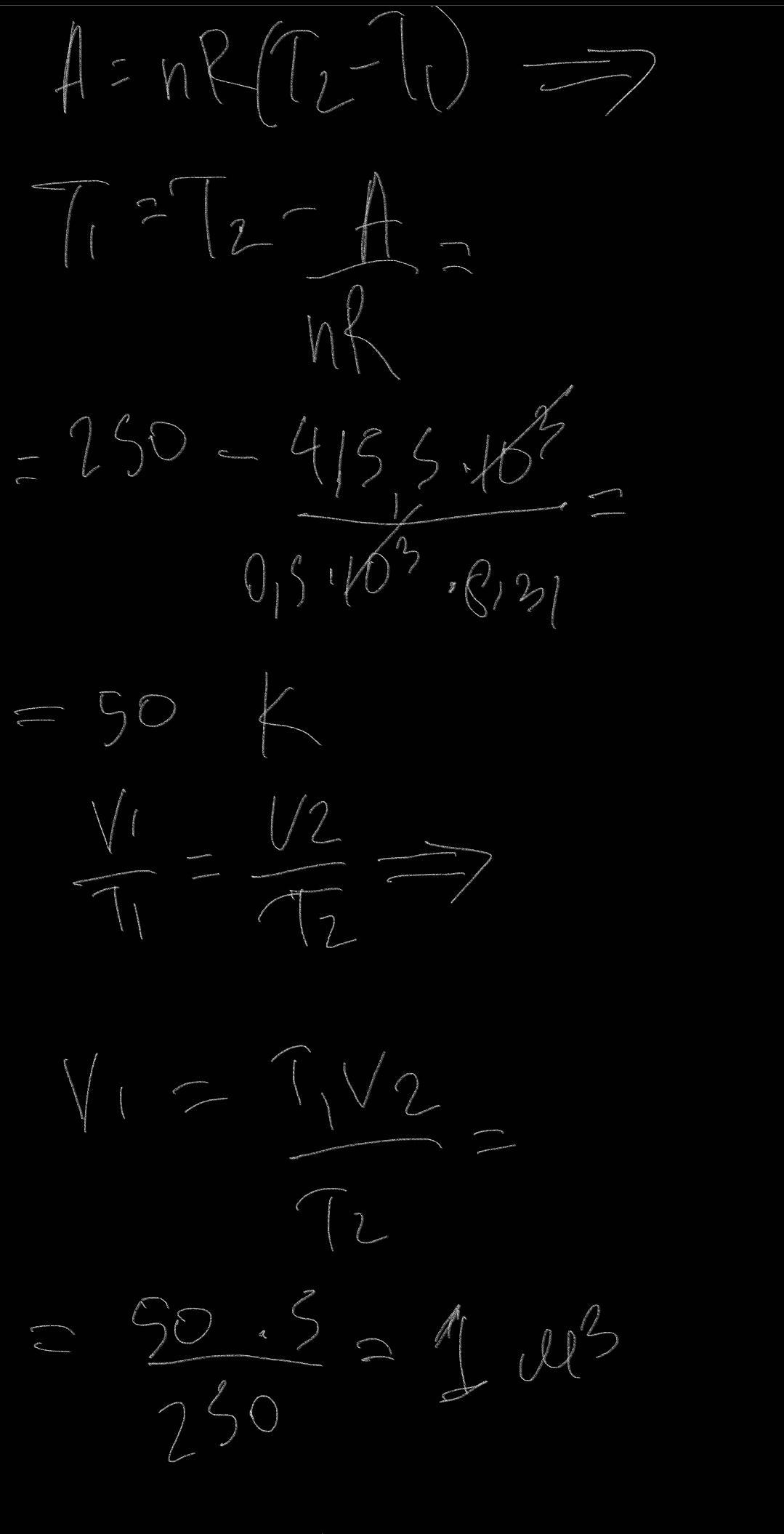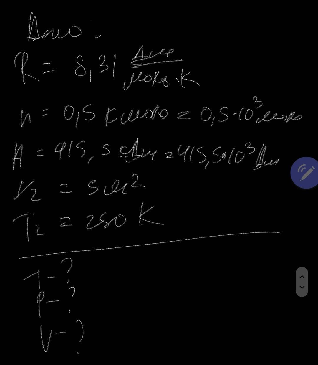 №1 При ізобарному розширенні 0,5 кмоль ідеального газу отримав енергію, за рахунок якої було виконано роботу 415,5 кДж та встановлено температуру 250К і отримано об’єм газу 5 м3. Знайдіть температуру, тиск і об’єм газу в початковому стані.