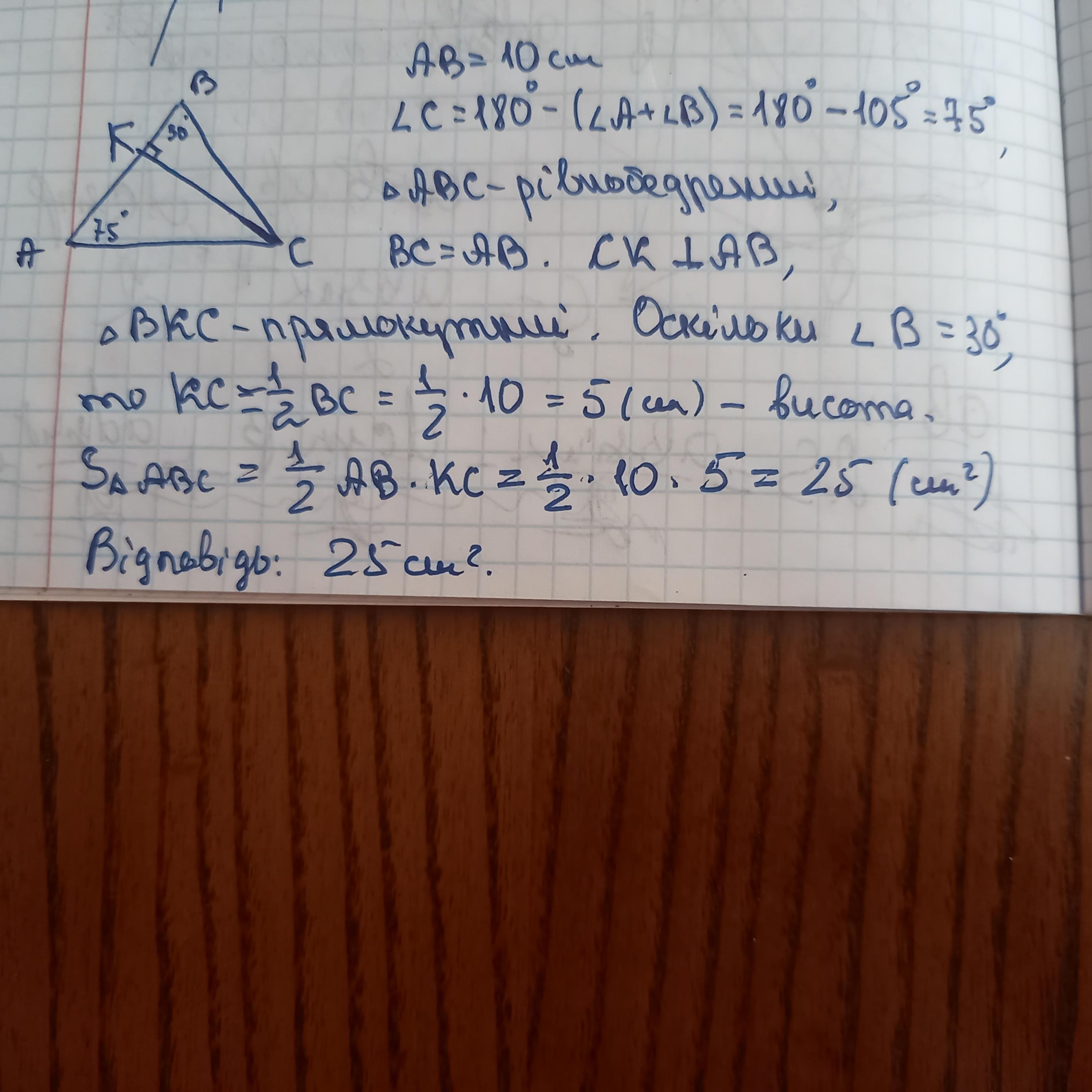 В трикутнику АВС ∠А=75°, ∠В=30°, АВ=10см. Знайти площу трикутника. (тільки без косінусів і синусів)