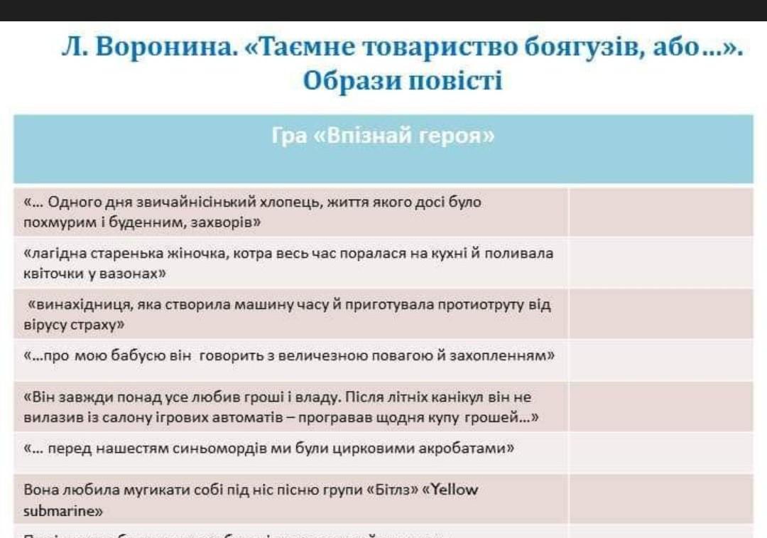 Л. Воронина. «Таємне товариство боягузів, або...». Образи повісті Гра «Впізнай героя»
