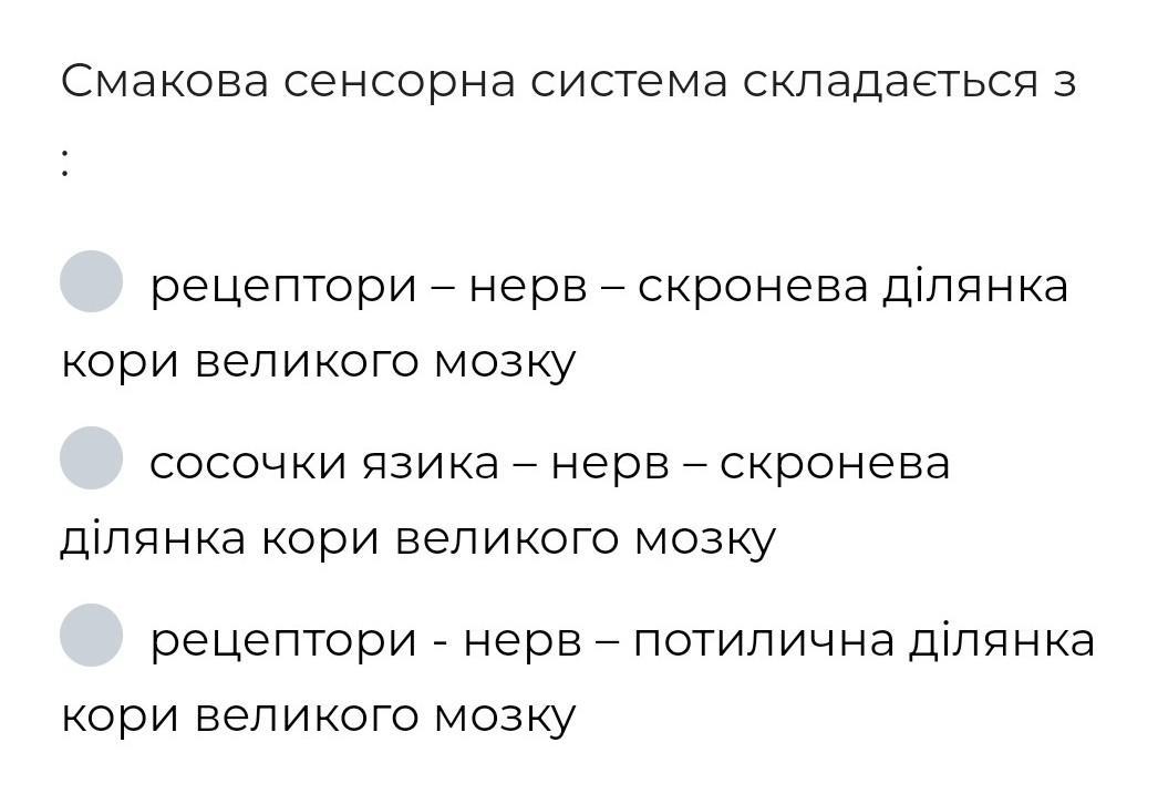 Смакова сенсорна система складається з рецептори-нерв-скронева ділянка кори великого мозку СОСОЧКИ ЯЗика – нерв – скронева ділянка кори великого мозку рецептори-нерв-потилична ділянка кори великого мозку