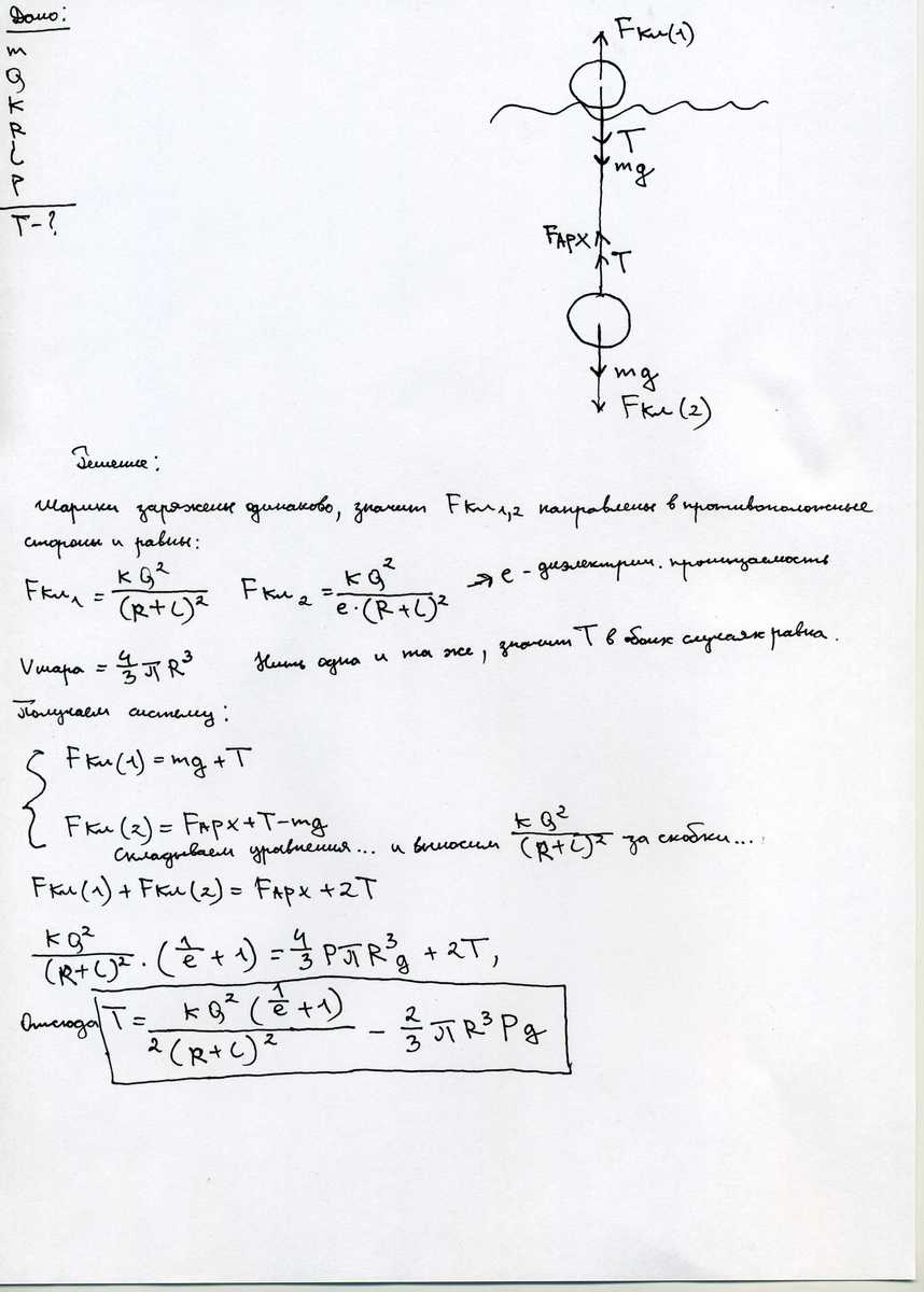 Найдите натяжение нити, соединяющей одинаковые шарики радусом r, в центре которых находятся одинаковые заряды Q. Один из шариков плавает на поверхности жидкости с плотностью P, второй шарик имеет массу m и висит на нити внутри жидкости. Расстояние между центрами шариков l.