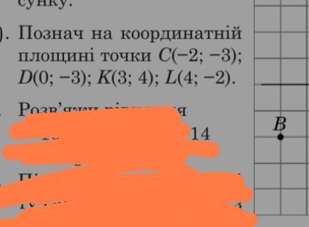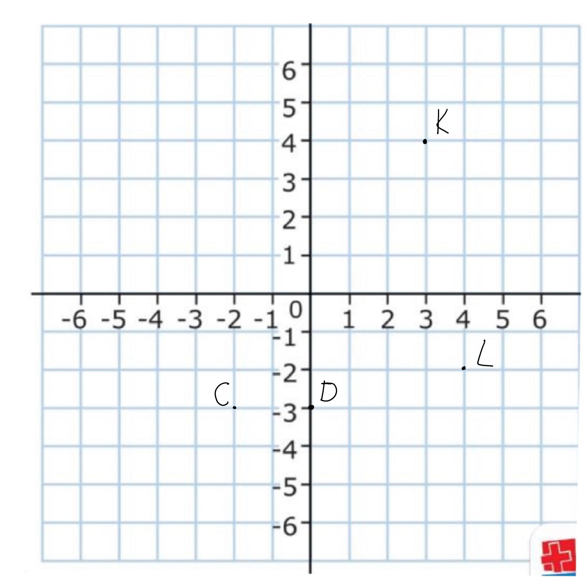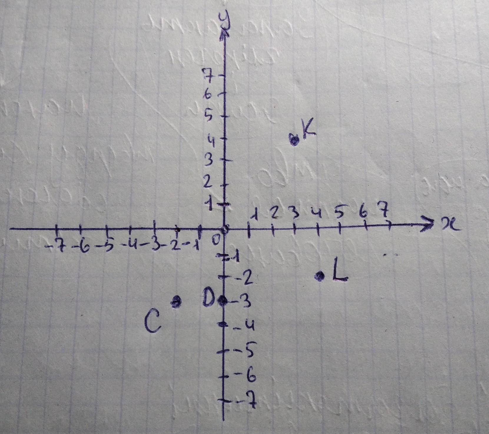 Познач на координатній площині точки С(-2; -3); D(0; -3); K(3; 4); L(4; -2)