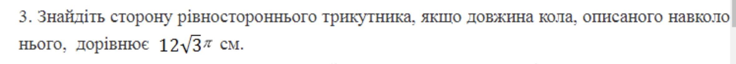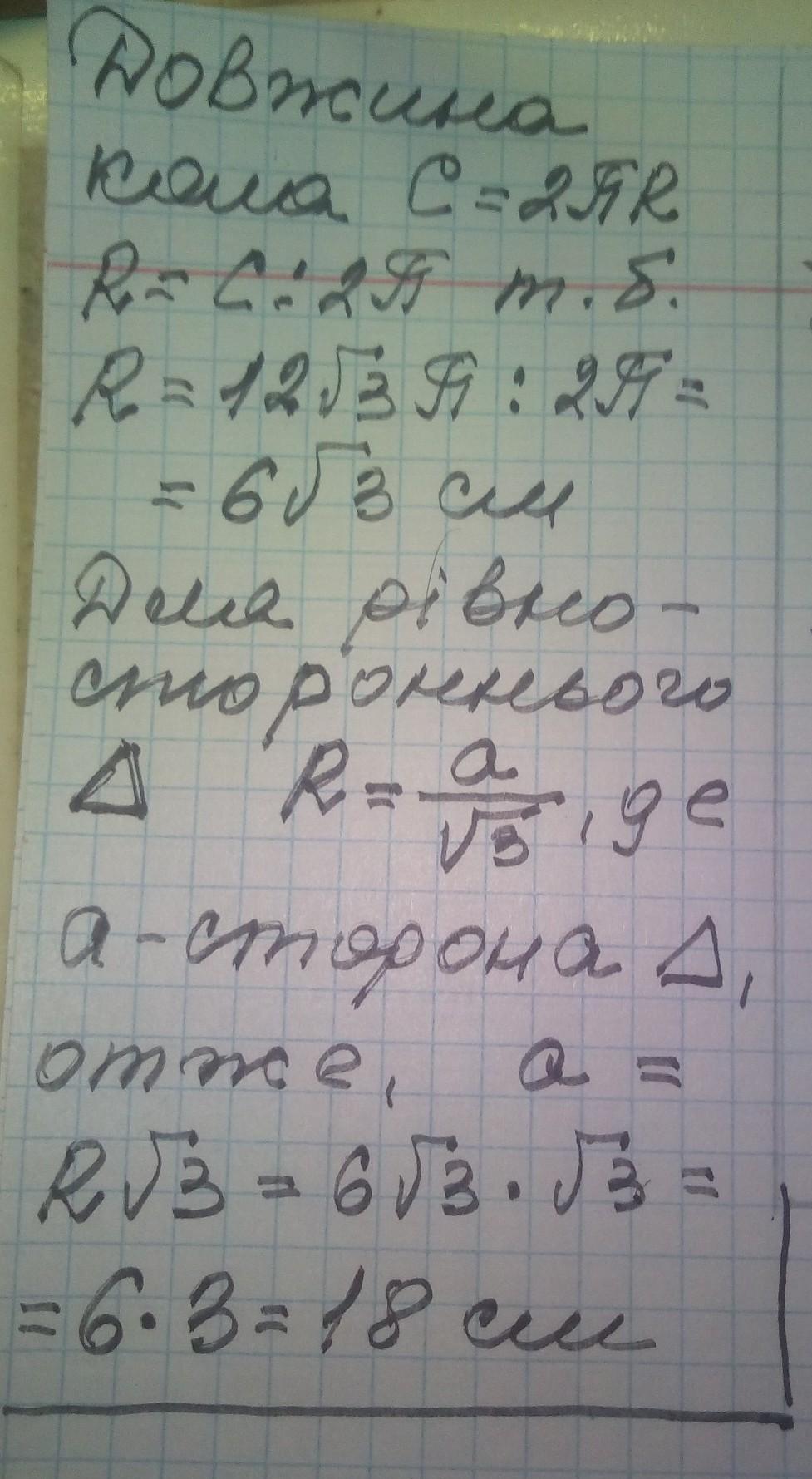 Знайдіть сторону рівностороннього трикутника, якщо довжина кола, описаного навколо нього, дорівнює 12√3π см.