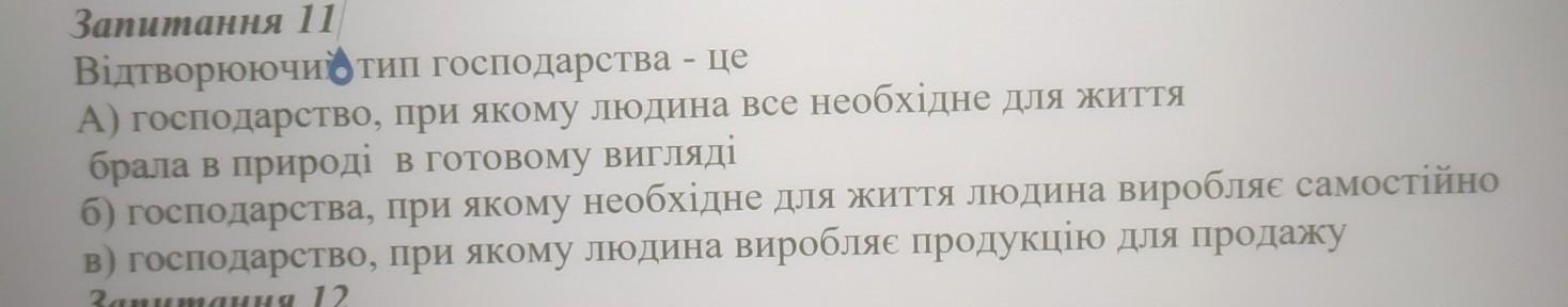 для продажу або обму на ринку Запитання 11 Відтворюючи тип господарства - це А) господарство, при якому людина все необхідне для життя брала в природі в готовому вигляді б) господарства, в) господарство, при якому необхідне для життя людина виробляє самостійно при якому людина виробляє продукцію для продажу