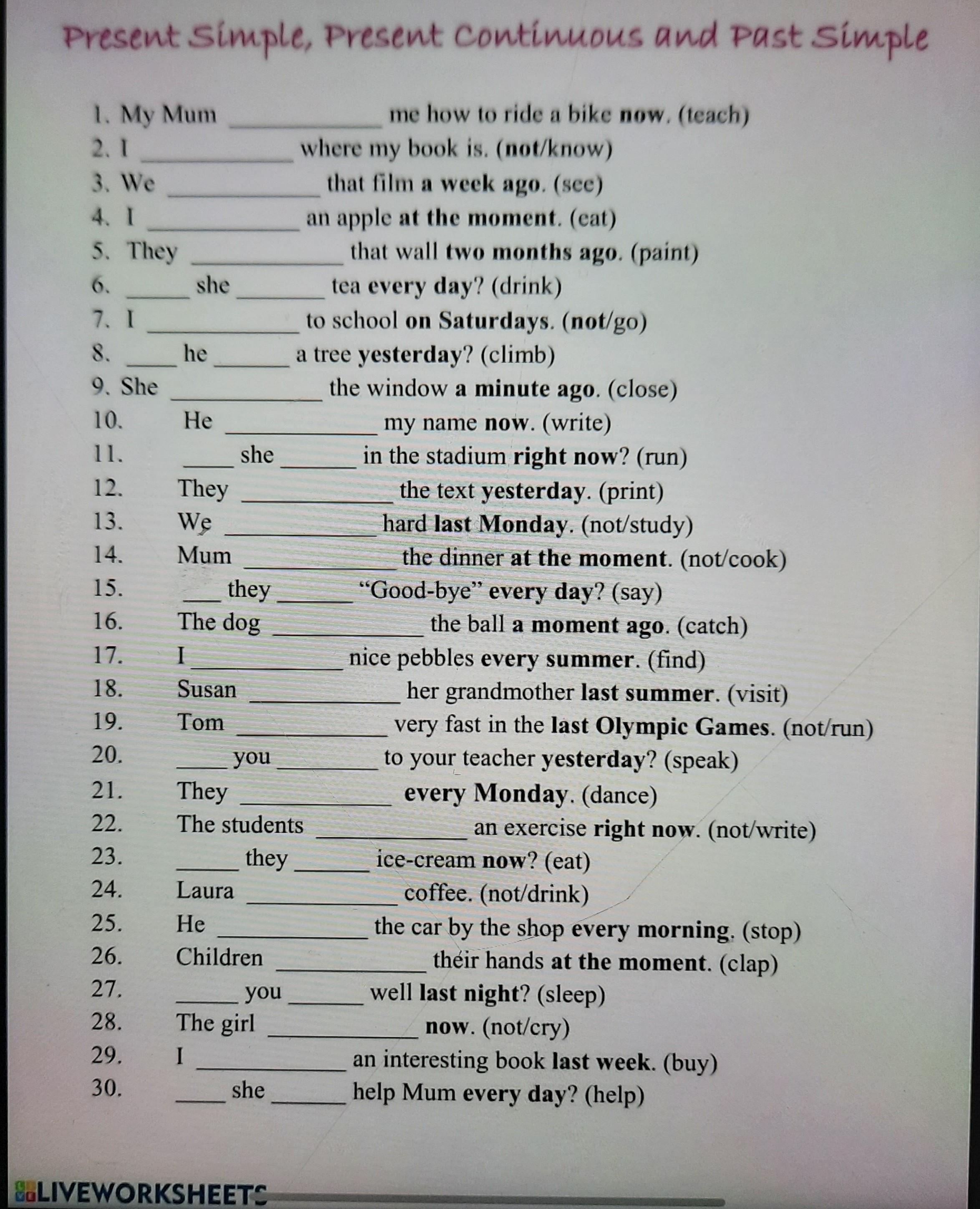 В задании три времени - Present Simple, Past Simple и Present Continuous. Чтобы понять какое время использовать, стоит обратить внимание на слова в жирном шрифте - это маркеры времени.