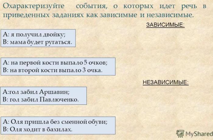 - В заданиях даны пары событий, связанных между собой. Событие А (получение двойки, выпадение 5 очков, забитие гола Аршавины) в каждой паре можно назвать независимым, так как оно не зависит от другого события В (мама будет ругаться, выпадение 3 очков, забитие гола Павлюченко). Событие В, в свою очередь, зависит от события А, так как оно является следствием независимого события.