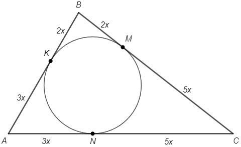 В трикутнику АВС точки К, М, N - точки дотику вписаного кола. Знайдіть сторони трикутника АВС, якщо ВМ : МС : АN = 2 : 5 : 3, а периметр трикутника 120 см.