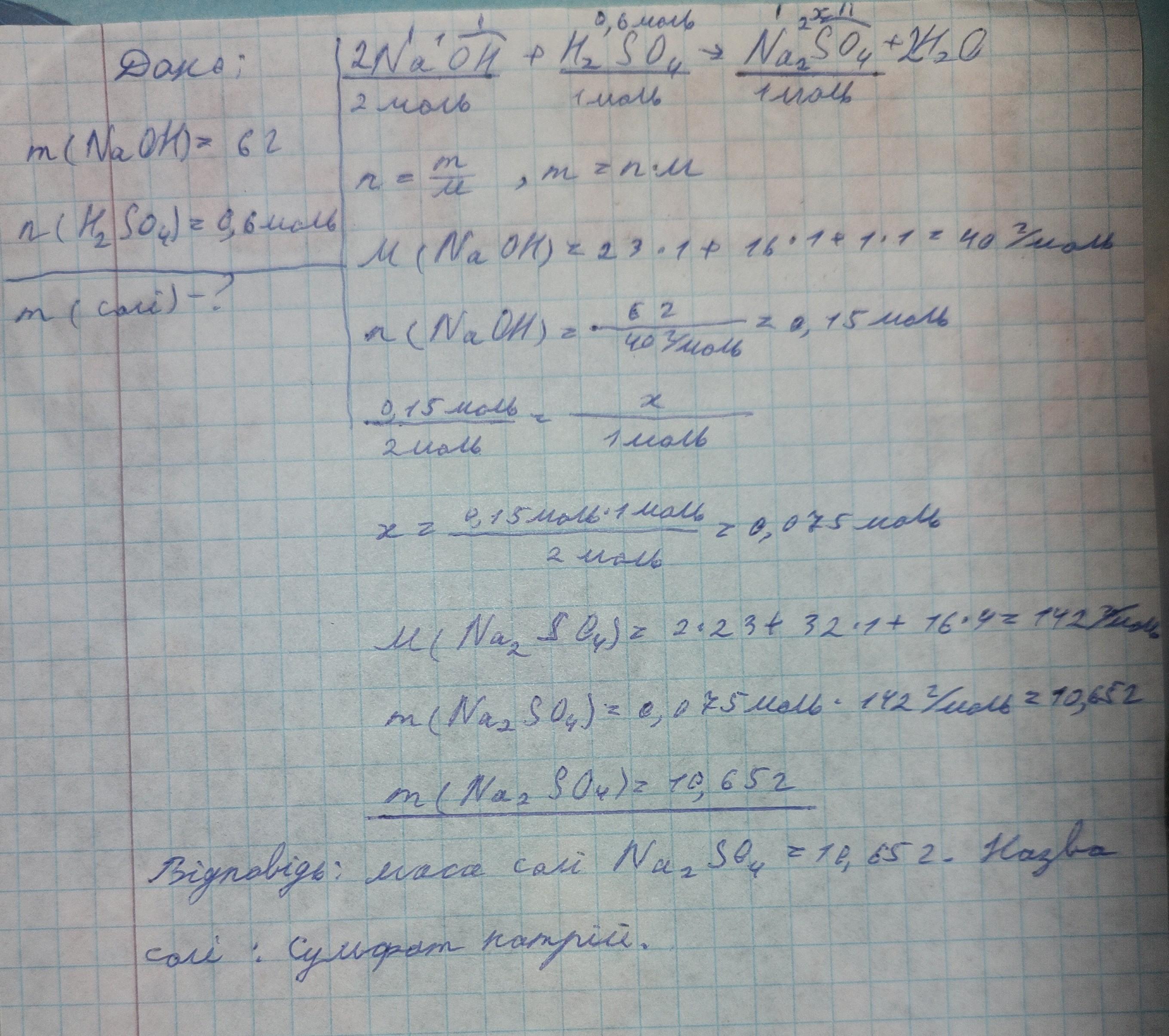 З цього рівняння видно, що 2 моль NaOH реагують з 1 моль H2SO4 для утворення 1 моль Na2SO4 (натрій сульфату).