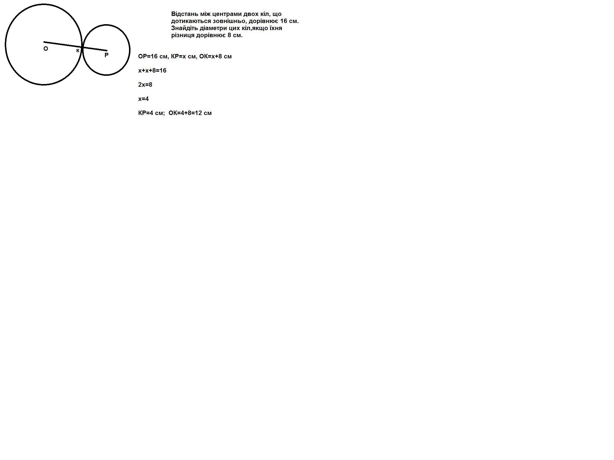 5. (36.) Відстань між центрами двох кiл,що дотикаються зовнішньо дорівнює 16см. Знайдіть діаметри цих кіл,якщо їхня рiзниця дорівнює 8cm. будь ласка допоможіть 50 балів