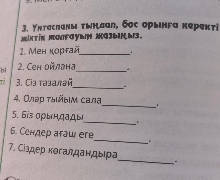 3. Унтаспаны тыңаап, бос орынға керекті жіктік жалғауын жазыңыз. 1. Мен қорғай 2. Сен ойлана 3. Сіз тазалай 4. Олар тыйым сала 5. Біз орындады 6. Сендер ағаш еге 7. Сiздер көгалдандыра