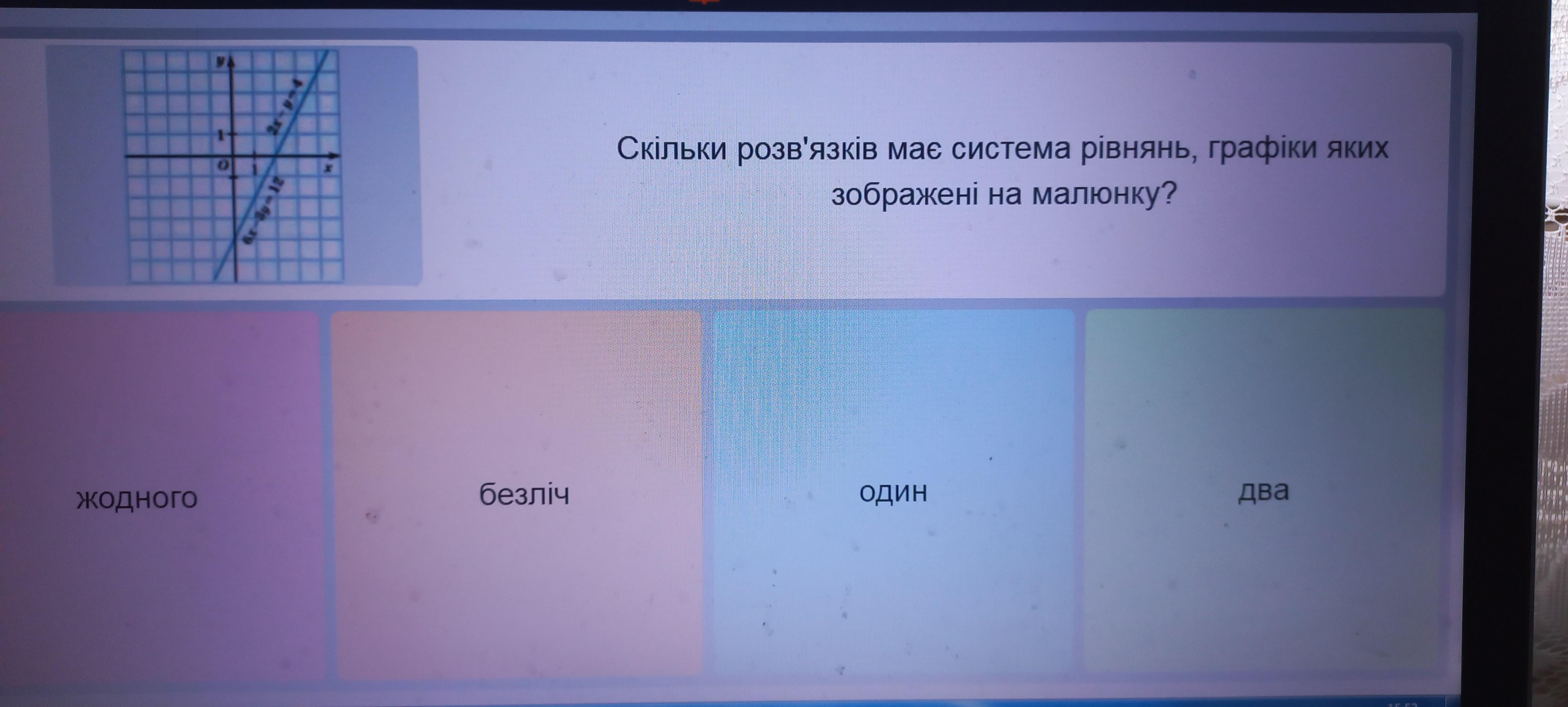 Скільки розв'язків має система рівнянь, графіки яких зображені на малюнку?