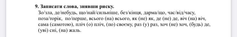 зо зла, де-небудь,що найсильніше, без кінця, дарма що, час від часу, поза-торік, по-перше, всього на всього, як не як, де-не-де, віч-на-віч, сама на самоті, пліч о пліч, по-своєму, раз у раз, хоч не хоч, будь-де, уві сні, на жаль.
