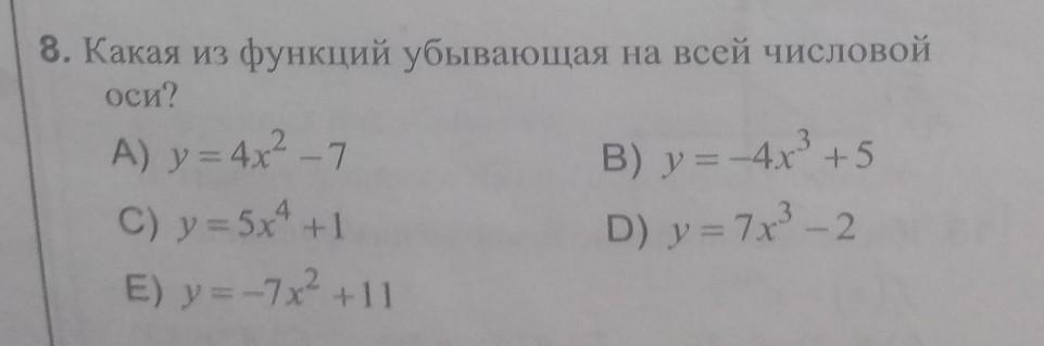 функции B) y=-4x3+5 и E) y=-7x2 +11 являются убывающими на всей числовой оси.