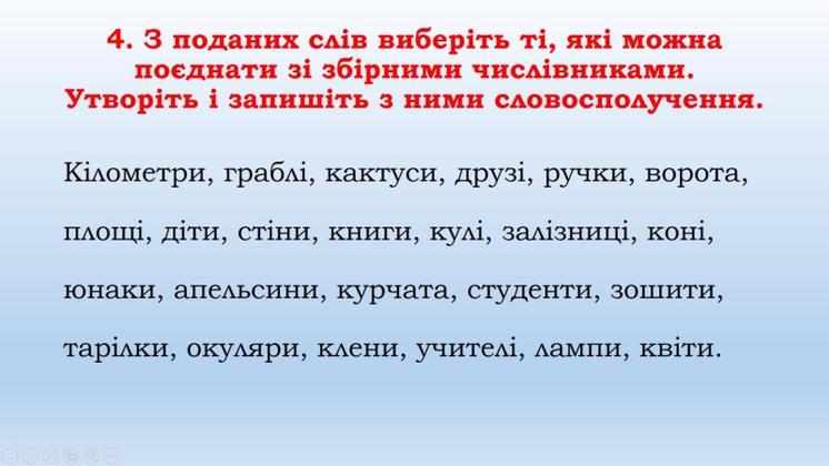 довгі кілометри, старі граблі, зрілі кактуси, вірні друзі, умілі ручки, великі ворота, неслухняні діти, тонкі стіни, товсті книги, повітряні кулі, гарні коні, розумні юнаки, солодкі апельсини, маленькі курчата, слухняні студенти, шкільні зошити, розбиті тарілки, сонцезахисні окуляри, величезні клени, добрі учителі, яскраві лампи, рідкісні квіти
