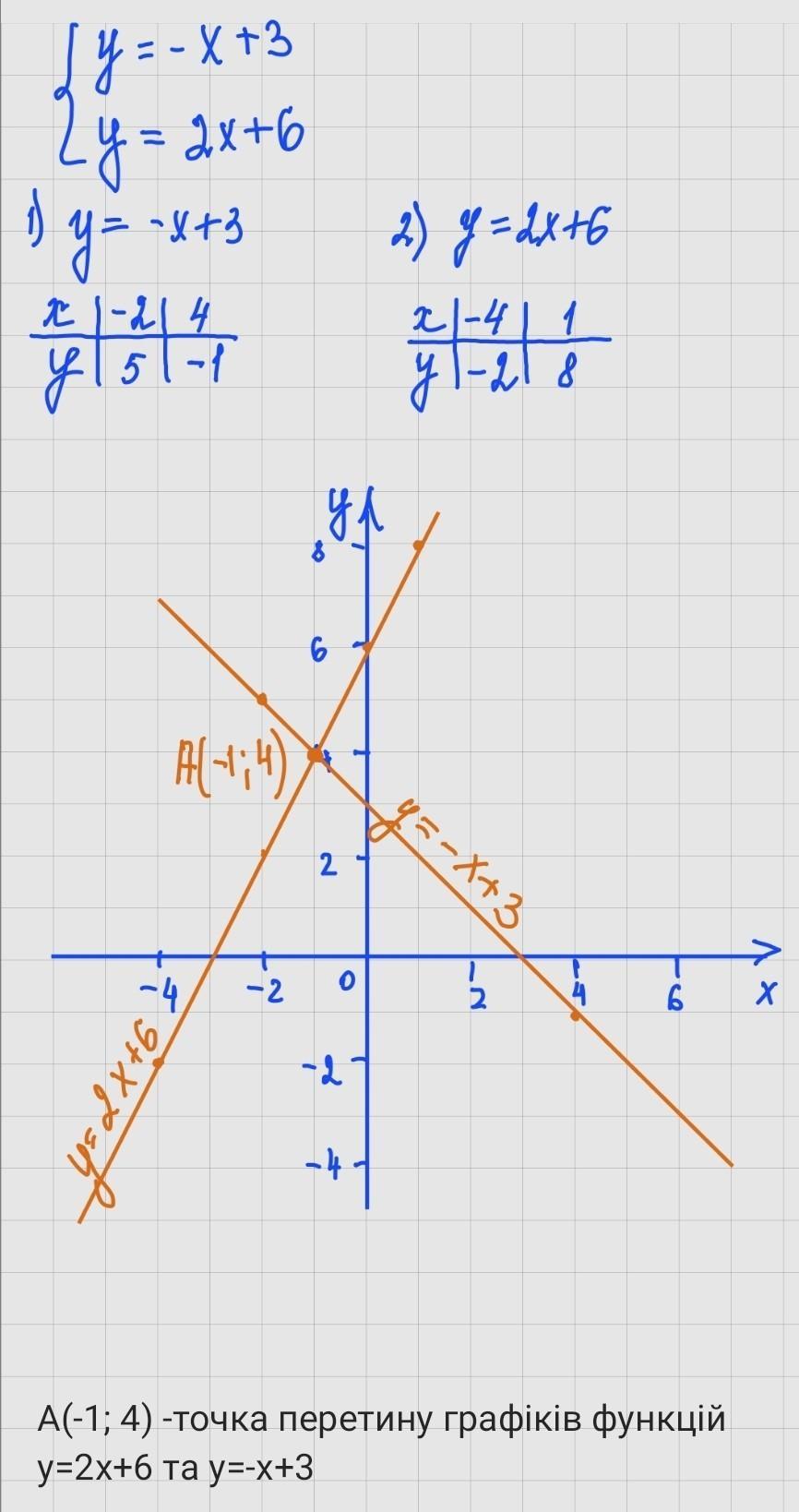побудуйте в одній системі координат графіки функції і вкажіть координати точки їх перетину: у=-х+3 та у=2х+6