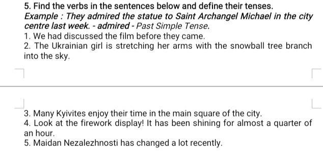 5. Find the verbs in the sentences below and define their tenses. Example: They admired the statue to Saint Archangel Michael in the city centre last week. - admired - Past Simple Tense. 1. We had discussed the film before they came. 2. The Ukrainian girl is stretching her arms with the snowball tree branch into the sky. 3. Many Kyivites enjoy their time in the main square of the city. 4. Look at the firework display! It has been shining for almost a quarter of an hour. 5. Maidan Nezalezhnosti has changed a lot recently.