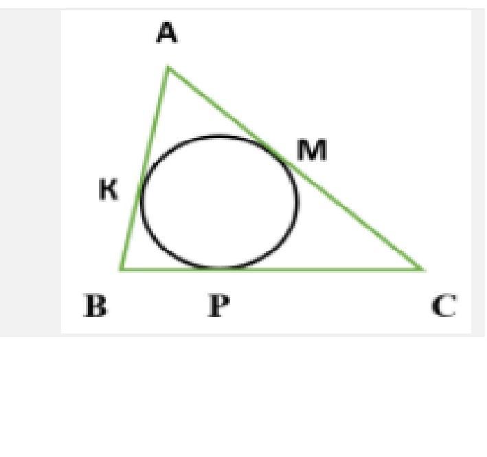 Треугольник ABC описан около окружности. AK=13 см, BP=12 см, CM=15 см; K, P, M - точки касания окружности со сторонами треугольника ABC.