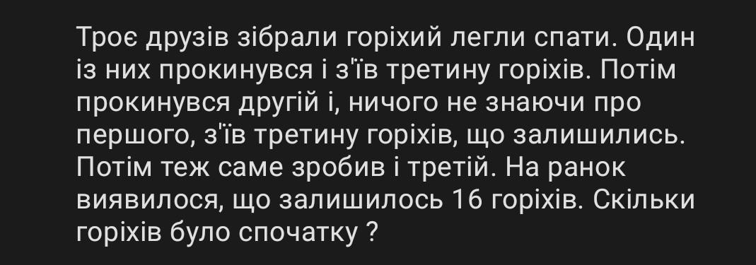 Троє друзів зібрали горіхий легли спати. Один із них прокинувся і з'їв третину горіхів. Потім прокинувся другій і, ничого не знаючи про першого, з'їв третину горіхів, що залишились. Потім теж саме зробив і третій. На ранок виявилося, що залишилось 16 горіхів. Скільки горіхів було спочатку ?
