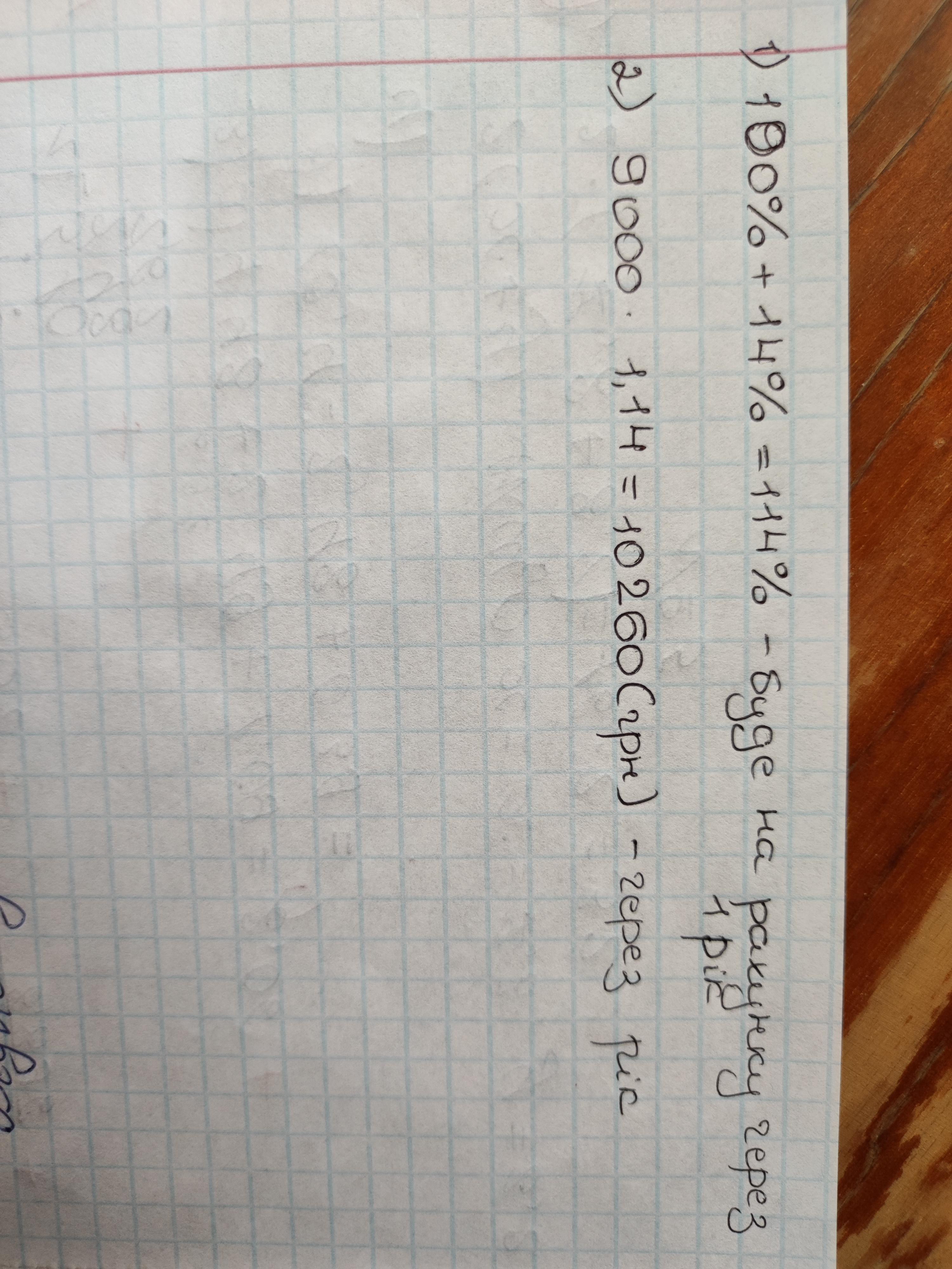 Вкладниця поклала до банку 9000 грн на депозитний рахунок. Банк нараховує 14% річних. Яка сума коштів буде на рахунку вкладниці через рік?