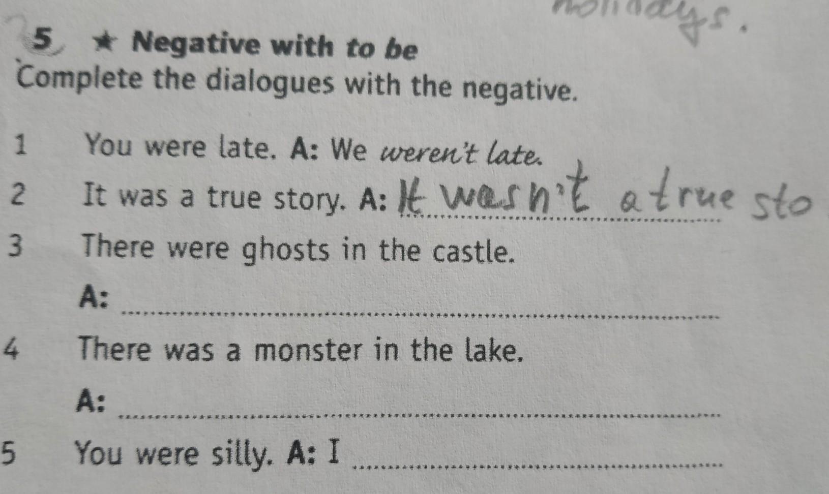 5, Negative with to be Complete the dialogues with the negative. You were late. A: We weren't late. It was a true story. A: It wasn't a true story There were ghosts in the castle. A: 4 There was a monster in the lake. A: 5 You were silly. A: I 1 2 3 ****
