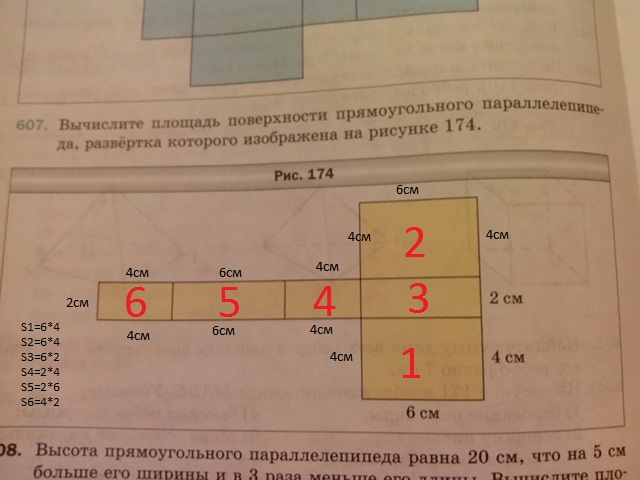 6*4+6*4+6*2+4*2+6*2+4*2=24+24+12+8+12+8=88cм^2