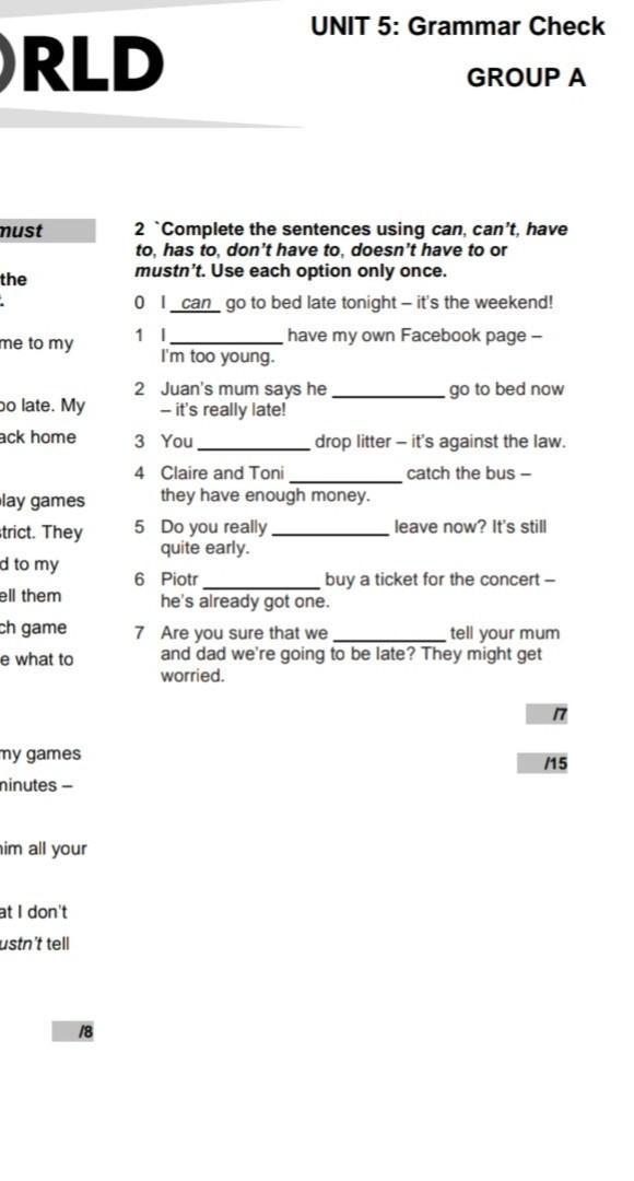 2 Complete the sentences using can, can't, have to, has to, don't have to, doesn't have to or mustn't. Use each option only once. 0 I can go to bed late tonight - it's the weekend! have my own Facebook page - 1 I don't have to I'm too young. to 2 Juan's mum says he also go to bed now hots - it's really late! You Claire and Toni they have enough money. 3 4 5 Do you really quite early. 6 Piotr drop litter- it's against the law. catch the bus - leave now? It's still buy a ticket for the concert - he's already got one. 7 Are you sure that we tell your mum and dad we're going to be late? They might get worried.