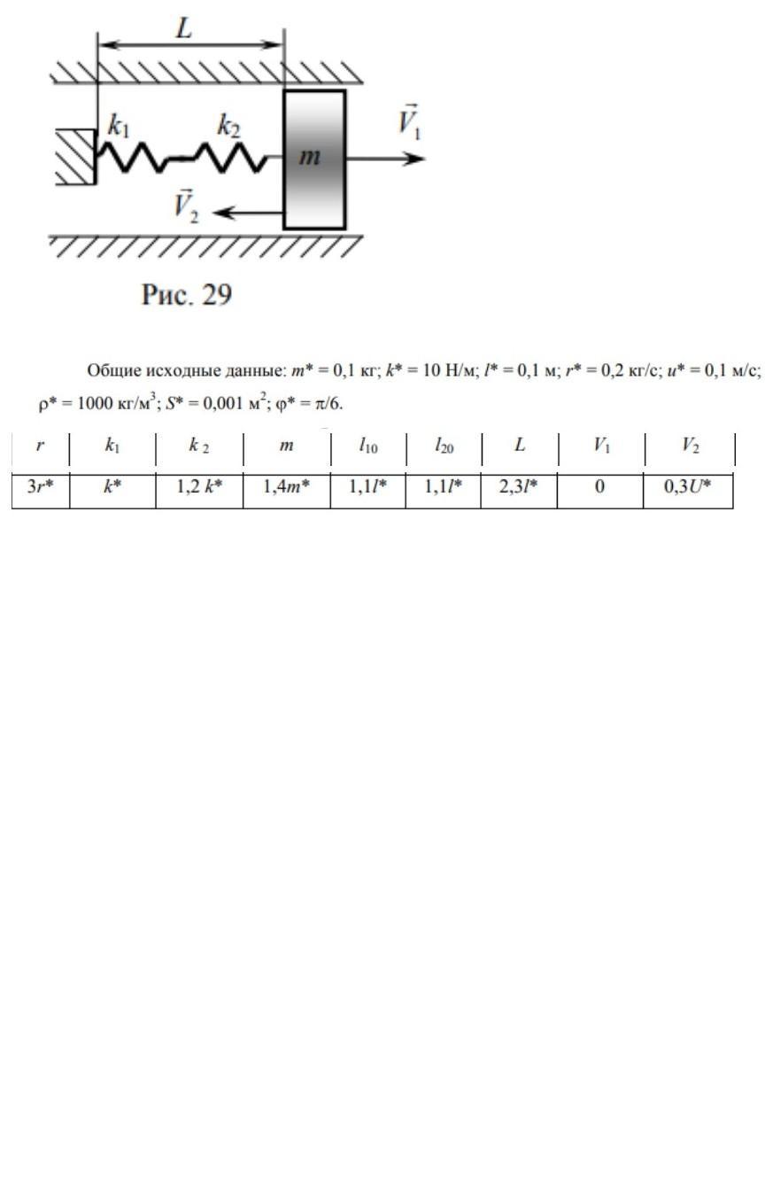 Колебательная система (КС), представленная на рис. 29, состоит из шайбы массой m и двух упругих пружин, имеющих жесткости k1 и k2 . Движение КС происходит в окружающей среде с малыми вязкими свойствами (малым коэффициентом сопротивления r). На рис. 29 колебания происходят под действием пружин, соединенных последовательно. Массой пружин можно пренебречь. На рис. 29 КС имеет горизонтальное расположение в поле силы тяжести. Длины 1-ой и 2-ой пружин в недеформированных состояниях равны l10 и l20. На рис.29 L - общая длина двух пружин в деформированном состоянии при t=0. Возможные векторы начальной скорости шайбы равны V1 , V2 . Шайбу, находящуюся в положении равновесия, смещают до расстояния L, а затем импульсом придают ей в начальный момент времени t=0 скорость V1 или V2. В результате КС приходит в колебательное движение.