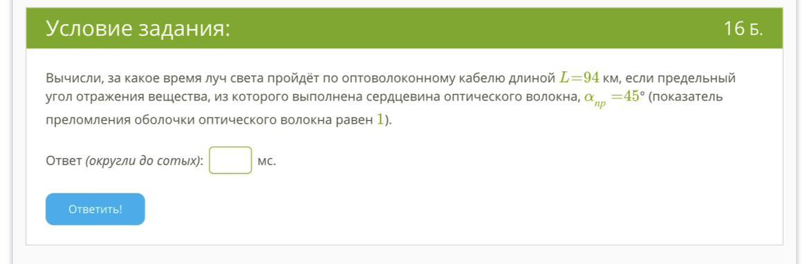 Для вычисления времени прохождения луча света по оптоволоконному кабелю воспользуемся законом преломления Снеллиуса:n1 * sin(α1) = n2 * sin(α2),где n1 - показатель преломления сердцевины оптического волокна, n2 - показатель преломления оболочки оптического волокна, α1 - угол падения луча света на границу раздела сред, α2 - угол преломления луча света внутри оптического волокна.При максимальном угле отражения a = 45° луч света будет падать на границу раздела сред под углом α1 = 90° - a = 45°. Так как показатель преломления оболочки оптического волокна равен 1, то n2 = 1.Тогда из закона преломления Снеллиуса:n1 * sin(α1) = n2 * sin(α2) = sin(α2),sin(α2) = n1 * sin(α1) = n1 * sin(45°) = 0.7071 * n1.Так как луч света при движении по оптическому волокну всегда будет падать на границу раздела сред под углом 45°, то угол преломления луча света внутри оптического волокна также будет равен 45°, т.е. α2 = 45°.Из закона преломления Снеллиуса:sin(α2) = n1 * sin(α1),получаем:0.7071 * n1 = n1 * sin(45°),n1 = 1 / sin(45°) = 1.4142.Таким образом, показатель преломления сердцевины оптического волокна равен 1.4142.Для вычисления времени прохождения луча света по оптоволоконному кабелю воспользуемся формулой:t = L / (v * n),где L - длина оптоволоконного кабеля, v - скорость света в вакууме, n - эффективный показатель преломления оптического волокна.Скорость света в вакууме v = 299792458 м/с.Эффективный показатель преломления оптического волокна можно вычислить по формуле:n = (n1^2 - n2^2)^0.5,где n1 - показатель преломления сердцевины оптического волокна, n2 - показатель преломления оболочки оптического волокна.Подставляя значения n1 = 1.4142 и n2 = 1 в эту формулу, получаем:n = (1.4142^2 - 1^2)^0.5 = 1.2247.Тогда время прохождения луча света по оптоволоконному кабелю будет равно:t = L / (v * n) = 94000 м / (299792458 м/с * 1.2247) ≈ 0.2498 с.Ответ: время прохождения луча света по оптоволоконному кабелю длиной 94 км при предельном угле отражения 45° равно примерно 0.25 секунд.